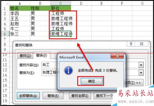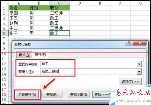 2、在“查找內容”文本框中輸入要查找的內容,這里輸入“助工”,在“替換為”文本框中輸入要替換的內容,這里輸入“助理工程師”,然后單擊“全部替換”按鈕,如下圖。