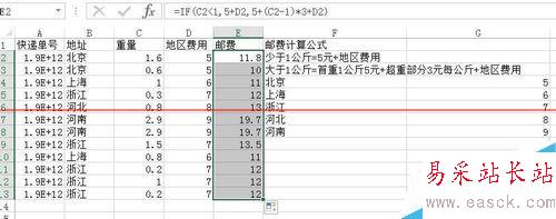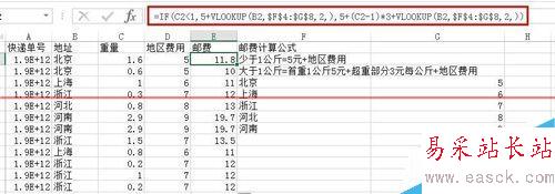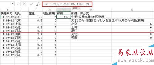 4、接下來(lái),就可以計(jì)算郵費(fèi)了,這里運(yùn)用了IF函數(shù)(這個(gè)之前的經(jīng)驗(yàn)也是說(shuō)過(guò),不清楚可以看看),公式如下圖,公式的意思就是,如果大于1則返回5元+地區(qū)費(fèi)用,如果大于1則返回,5元+超過(guò)1以外的乘以3+地區(qū)費(fèi)用。