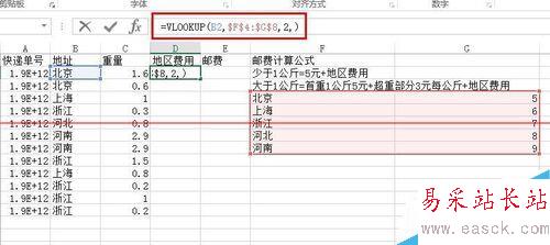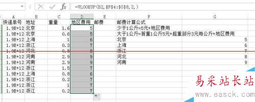 2、首先新建一個(gè)輔助列,稱(chēng)為地區(qū)費(fèi)用,我們用VLOOKUP把地區(qū)費(fèi)用都引用過(guò)來(lái),公式如圖,如果不了解VLOOKUP函數(shù)的話(huà),可以看之前的經(jīng)驗(yàn)