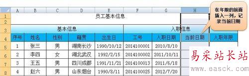 2.在記錄年限的前面插入一列,作為當前日期的記錄列,標題為“當前日期”也就是當天的日期;
