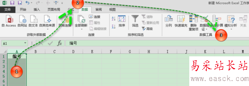 首先,在A列上方插入光標選中A列,在excel的菜單欄切換到“數據”選項卡,找到“數據工具”菜單組。