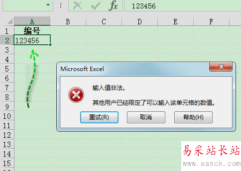 確定后試試在A列輸入“123456”不會成功并彈出錯誤警告。