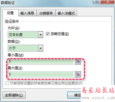 文本長度下“數據”處選擇“介于”,“最大值”與“最小值”均填寫5。
