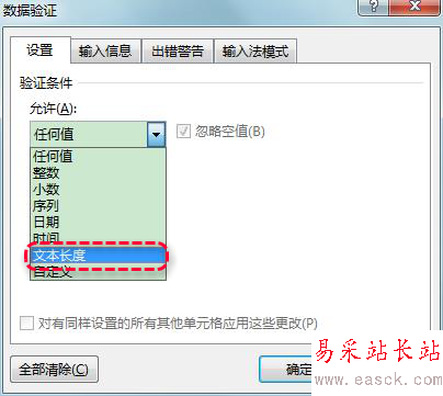 目的是要限定A列輸入的文本個數,所以在“設置”選項卡的驗證條件“允許”里面選擇“文本長度”。