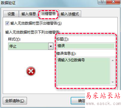 其實,錯誤警告的內容是可以自行設置的,如圖,還是在“數據驗證”,切到“出錯警告”選項卡,然后自行填寫警告標題與內容就可以了。比如小編填寫“標題:錯誤 內容:請輸入5位數編號”。