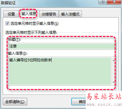 還有呢,在輸入信息前當點擊單元格時可以讓其顯示輸入提醒。這個操作還是在“數據驗證”下,在“輸入信息”選項卡。小編的提醒設置為“標題:注意 內容:請輸入編號為5為阿拉伯數字”。