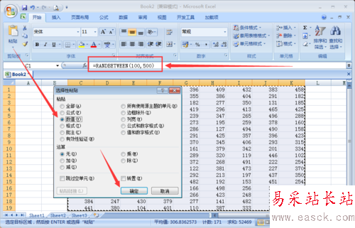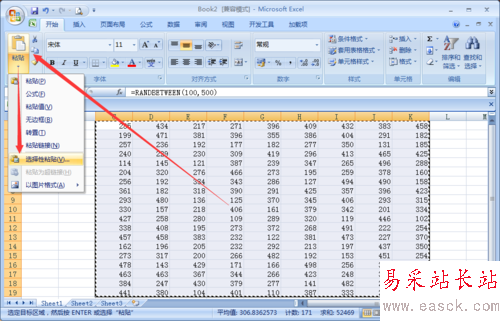 接下來把RANDBETWEEN函數生成的隨機數字變成數字式,將生成的隨意數字全部選擇,按鍵盤上的【ctrl+c】復制一下。單擊【粘貼下拉菜單里面的選擇性粘貼】。
