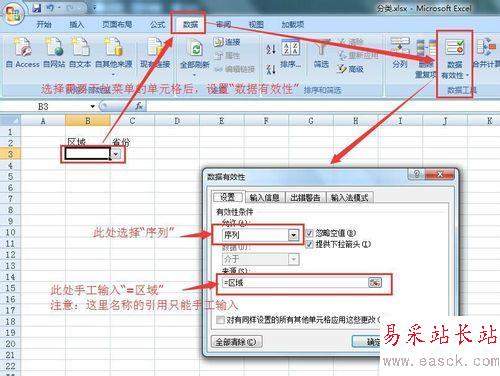 3)允許選擇“序列”,來源手工輸入“=區域”,這里“區域”就是對應名稱管理器中我們定義的“區域”