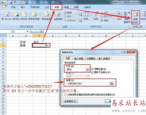 4)允許選擇“序列”,來源手工輸入“=INDIRECT(B3)”,這里“B3”就是上一步中設置的“區域”單元格的位置
