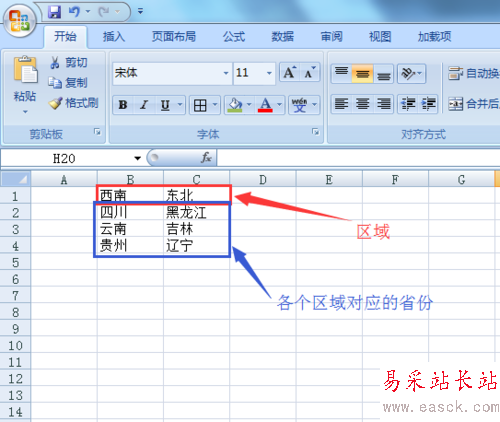 在excel中整理所有分類數據,如圖所示,橫向是“區域”,縱向是各個區域下對應的“省份”。