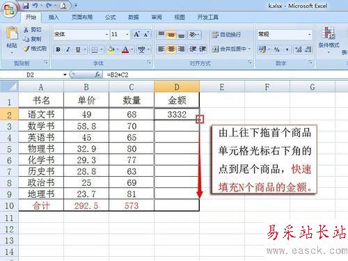 由上往下拖首個商品單元格光標右下角的點到尾個商品,快速填充N個商品的金額。