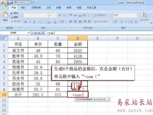 生成N個商品的金額后,在總金額(合計)單元格中輸入“=sum(”。