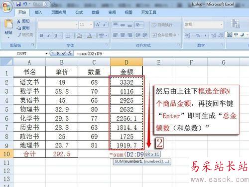 然后由上往下框選全部N個商品金額,再按回車鍵“Enter”即可生成“總金額數(和總數)”。