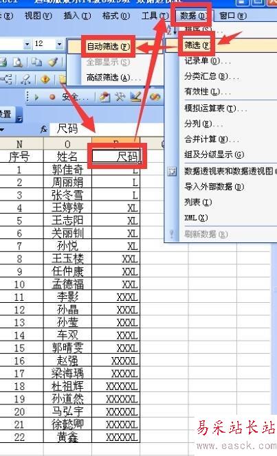 4、點擊尺碼 然后點數據 篩選 自動篩選命令