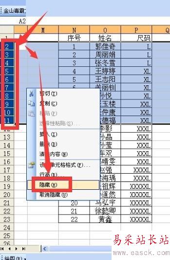 2、點擊第二行標簽 拖動到第十一行標簽 選中這幾行 點擊右鍵 隱藏