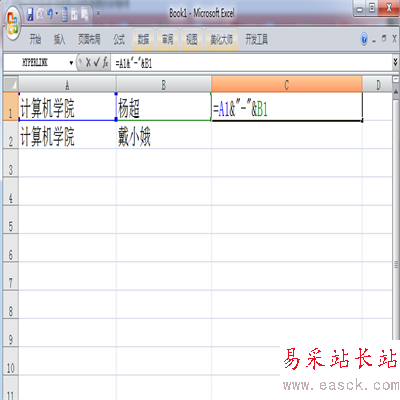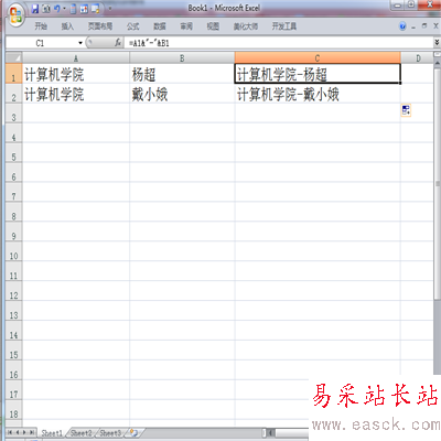 7、在C1單元格中輸入公式”=A1&"-"&B1“按回車鍵即可看到數據合并成功。