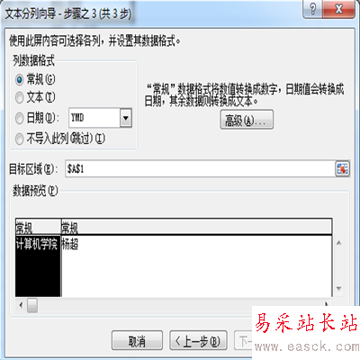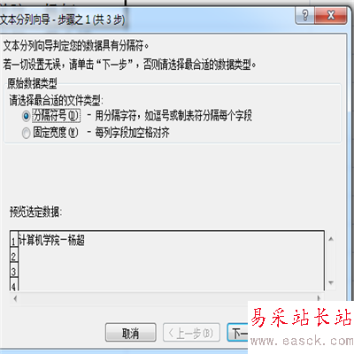 4、點擊"分列"即打開"文本分列向導"對話框,在第一個對話框下點擊下方"下一步"