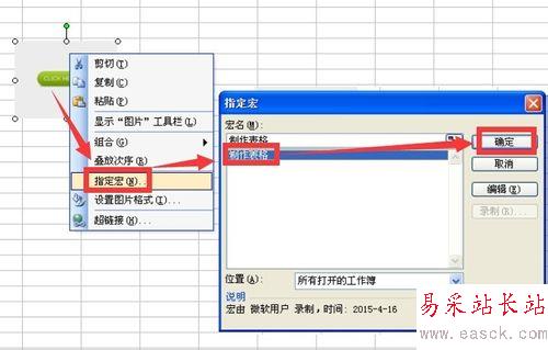 選擇圖片 單擊右鍵 在彈出的快捷菜單中選擇指定宏命令 然后選中制作表格 點按確定