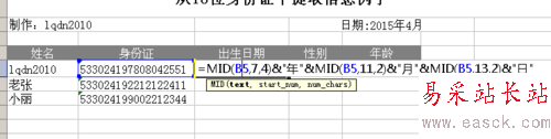 18位的新一代身份證了,里面的數字都是有規律的。前6位數字是戶籍所在地的代碼,7-14位就是出生日期。第17位“2”代表的是性別,偶數為女性,奇數為男性。我們要做的就是把其中的部分數字利用了涵數“提取出來”。