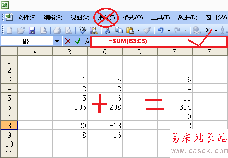 通常情況下,大家在使用函數(shù)的時(shí)候都是點(diǎn)擊工具欄的“插入圖標(biāo)”,然后在所屬列表中選擇“函數(shù)”。這樣的方法不是不行但是很慢,其實(shí)不需要這么麻煩,我們可以直接在工具欄下面的文本框中輸入函數(shù)內(nèi)容即可。比如求和函數(shù),直接輸入“=SUM(B3+C3)”,B、C代表單元格的橫坐標(biāo),3代表縱坐標(biāo)。設(shè)置之后在這些單元中輸入數(shù)值,那么添加過(guò)SUM函數(shù)的單元格將會(huì)自動(dòng)顯示它門(mén)的總和。