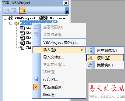 按ALT+F11打開VBE編輯器,在工程窗口下的Microsoft Excel對象右鍵-插入-模塊,新建一個模塊1。