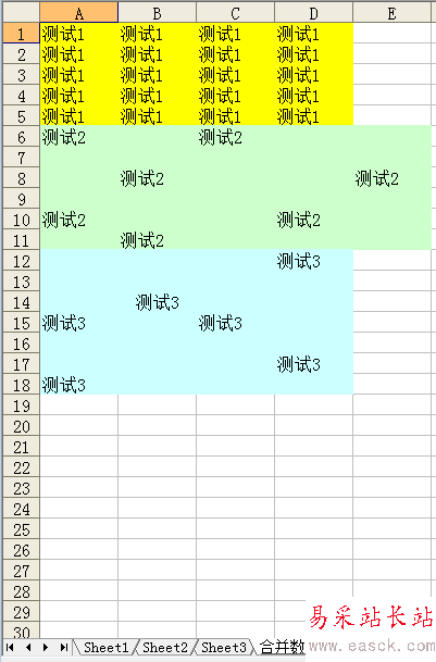 分別有工作表1、2、3數(shù)據(jù)區(qū)域如下圖所示: