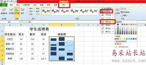 5、選擇“迷你圖工具”下的“設計”選項卡,單擊“標記顏色”按鈕,在彈出的菜單中選擇“高點”項,單擊自己喜歡的顏色,如圖。