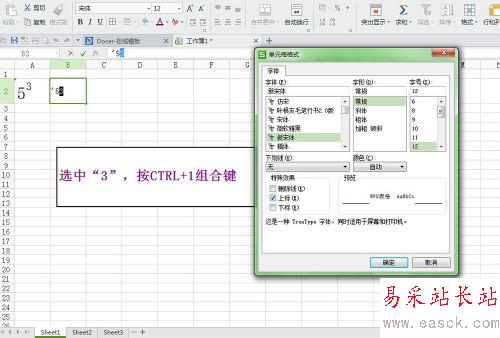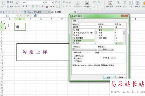 在單元格格式中勾選“上標”;