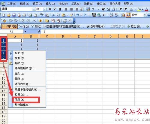 鼠標點按1行標簽向下拖動到5行標簽,然后點擊右鍵,選擇隱藏。