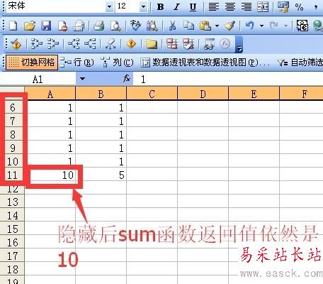 隱藏5行之后sum函數(shù)的返回值依然是10。