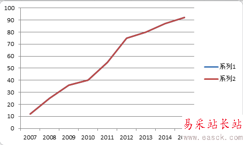 第1個步驟是為了生成折線圖,本步驟是為了生成面積圖,如圖1所示,再次選擇數據列,Ctrl+C拷貝,選中圖表區,Ctrl+V粘貼,這時發現一條相同的曲線覆蓋了原有曲線,如圖2所示。