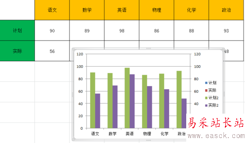 再添加兩個系列,數據選擇分別選擇“計劃”、“實際”那兩行的數據,系列名分別為“計劃2”“實際2”,不過將他們設置在次坐標軸。設置之后,暫時只能看到“計劃2”“實際2”這兩列數據對應的圖形。