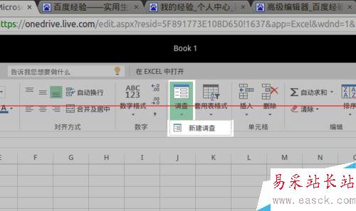 新建一個(gè)空白表格,可以看到在開始選項(xiàng)卡-->表組,有個(gè)調(diào)查按鈕。單擊按鈕-->新建調(diào)查,彈出編輯調(diào)查向?qū)Т翱冢覀兛梢蚤_始準(zhǔn)備調(diào)查問卷了。