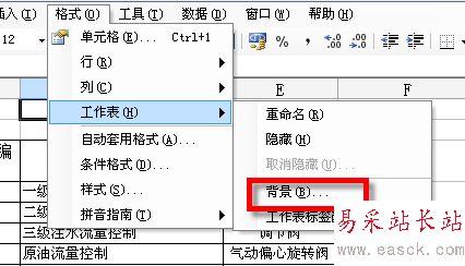 2、找到菜單欄“格式”-“工作表”-“背景...”,選擇一副圖片作為背景。