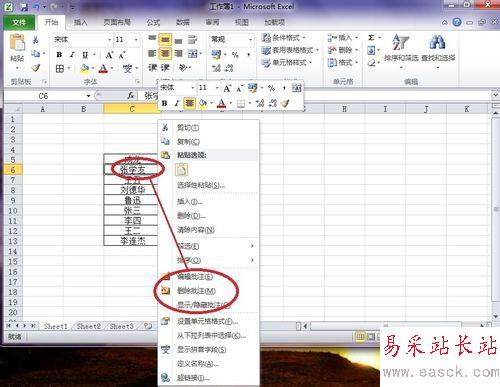5、當你發現你的批注不完整或批注錯誤需要修改的時候,你可以再次選定該單元格或文學,點擊右鍵,在右鍵菜單中選擇“編輯批注”或“刪除批注”或:顯示/隱藏批注“,重新設置即可。