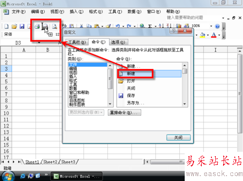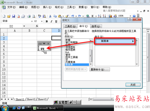 3、切換到“自定義”對話框的“命令”選項卡,在左側“類別”最下面找到“新菜單”,點擊后,選擇右側“新菜單”拖動到上述新建的工具欄上,建立一個菜單。