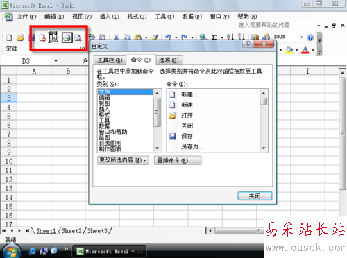 3、“自定義”對話框在“命令”選項卡時,可以拖動任意命令到菜單欄或者工具欄。