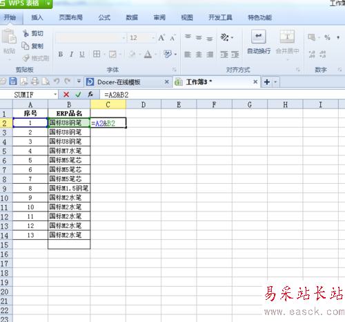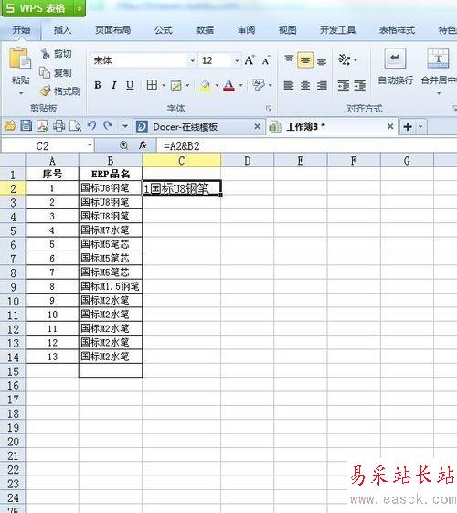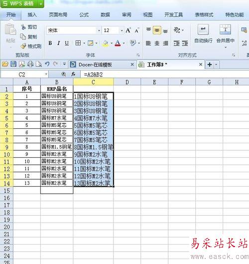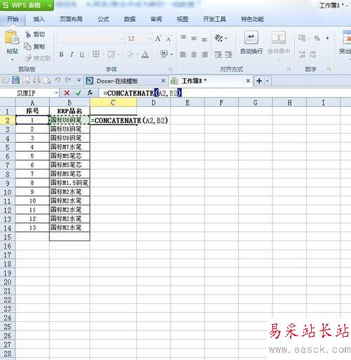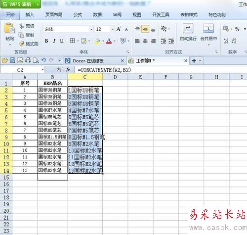 1、在C2中輸入公式=CONCATENATE(A2,B2)