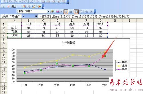 4、按下delete鍵 然后查看粉色的圖例項(xiàng)已經(jīng)被刪除 但是粉色的折線圖系列依然在圖表繪圖區(qū)存在