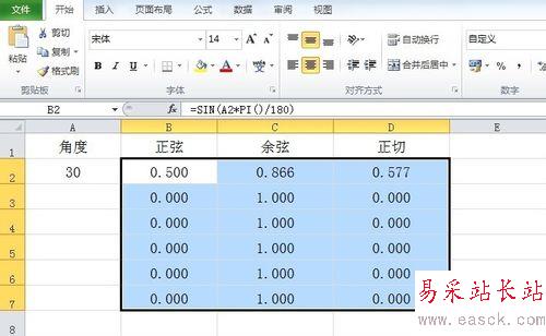1、打開工作表,在A2單元格里輸入要計算的角度值,在B2,C2,D2單元格中分別輸入需要計算的三角函數。