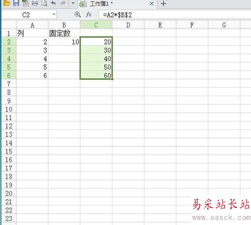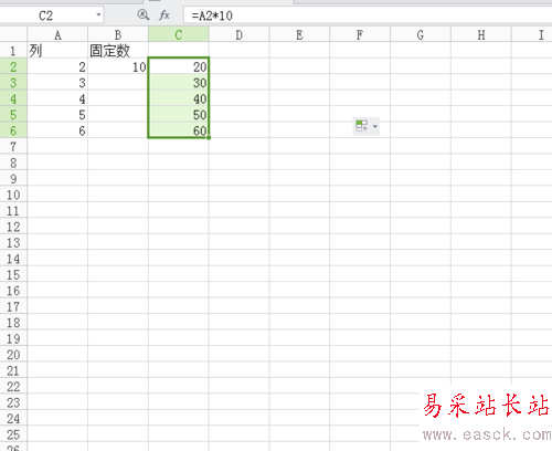 2、假設是A列,要剩固定數(10),那么在輸入C2=A2*$B$2,修改B2,確定回車后,用鼠標放在單元格的右下角黑點處,呈黑十字時,向下拉動鼠標填充。c列就是你要 。如圖下