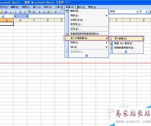 3、在計算機上新建一個Excel文件并打開,點擊菜單欄-數據-導入外部數據-導入數據。