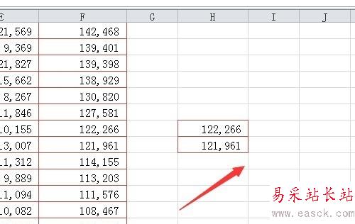 1、在excel表格中,我們復(fù)制其中兩個(gè)單元格的數(shù)字“122,266”、“121,961”,粘貼到旁邊的空白單元格中,右下角就出現(xiàn)了粘貼選項(xiàng)按鈕。