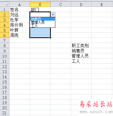 對話框出來后,設置有效性條件允許“序列”,數據來源為“銷售員,管理人員,工人”(中間間隔符號為英文標點符號)