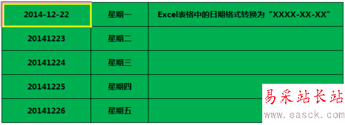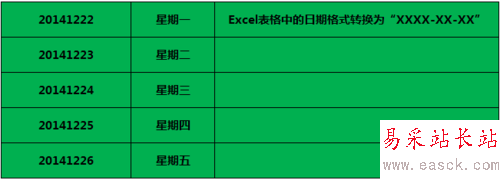 創(chuàng)建一個(gè)Excel表格,要求表格中有需要進(jìn)行規(guī)范化顯示的日期時(shí)間。將如圖中日期格式“20141222”自動(dòng)轉(zhuǎn)換為“2014-12-22”。