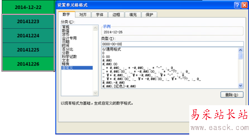 現(xiàn)在測(cè)試批量操作,選中B12-B15的單元格,右鍵“設(shè)置單元格格式”,將數(shù)字選項(xiàng)卡下的“自定義”一項(xiàng)的類型設(shè)置為“0000-00-00”,如圖所示。