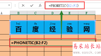4、選中合并出來的單元格,在如圖所示的公示欄輸入“=PHONETIC(B2:F2)”公式。