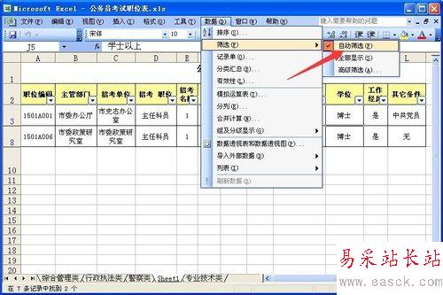 選中你所要篩選的內(nèi)容,單擊“數(shù)據(jù)”菜單中“篩選”命令,再點(diǎn)擊“自動(dòng)篩選”子菜單。