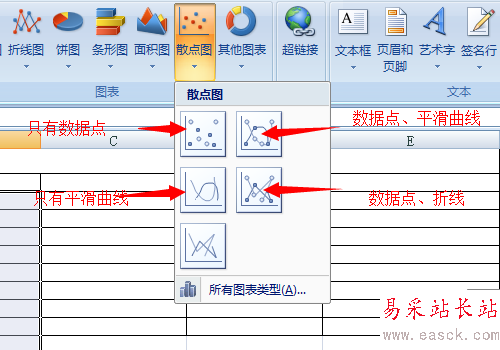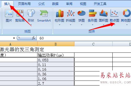 在菜單欄中點“插入”,然后選擇“散點圖”下面的下拉菜單。