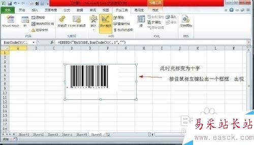 2、這時(shí)鼠標(biāo)指針變成細(xì)十字形,在工作表中拖動(dòng)鼠標(biāo)繪制一個(gè)條形碼控件并調(diào)整其位置和大小。